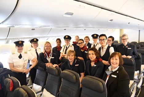 - Aujourd’hui, les vols AC868 Toronto–Londres Heathrow et AC15 Toronto–Hong Kong sont assurés par des équipages entièrement féminins.