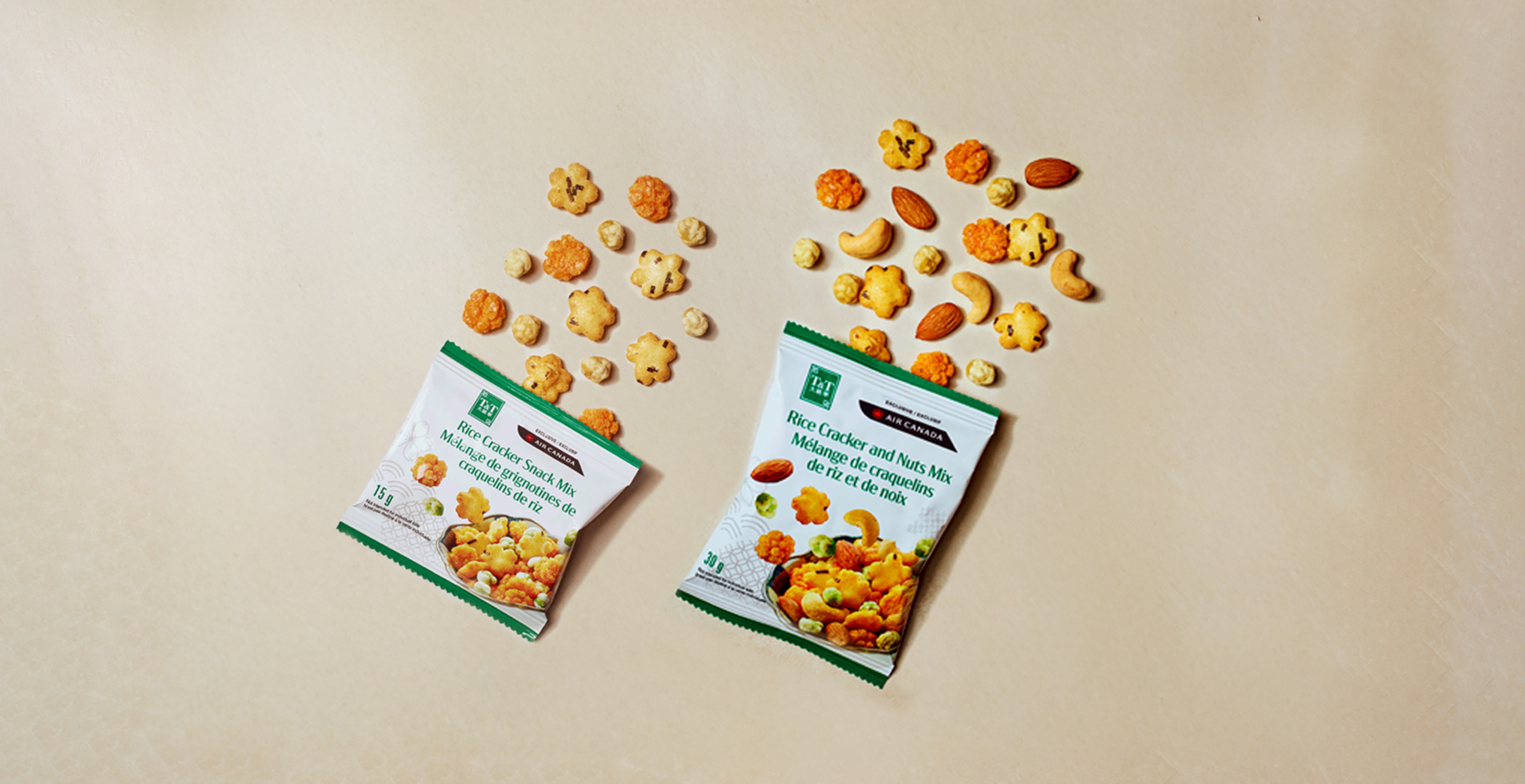 Nous avons ajouté à notre gamme de collations en vol une grignotine croustillante très appréciée des Canadiens, produite par le supermarché T&T, dirigé par des femmes! Dégustez ce mélange de craquelins de riz à bord de nos vols au départ et à destination de l’Asie, ou gâtez-vous avec le mélange de craquelins de riz et de noix disponible dans notre corbeille de collations de qualité à bord de tous nos vols. Préparez-vous à découvrir de savoureuses grignotines croustillantes qui élèveront vos collations vers de nouveaux sommets.